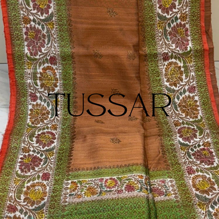 Tussar silk, also known as Tussah or Kosa silk, is a coarse, copperish silk fabric made from the cocoons of silk moths. The silkworms feed on plants like asan and Arjun, lending it a distinct charm that sets it apart from cultivated silk varieties. Pure tussar silk sarees are hand spun and colored with natural dyes. The use of natural vegetable dyes makes the fabric eco-friendly and sustainable.