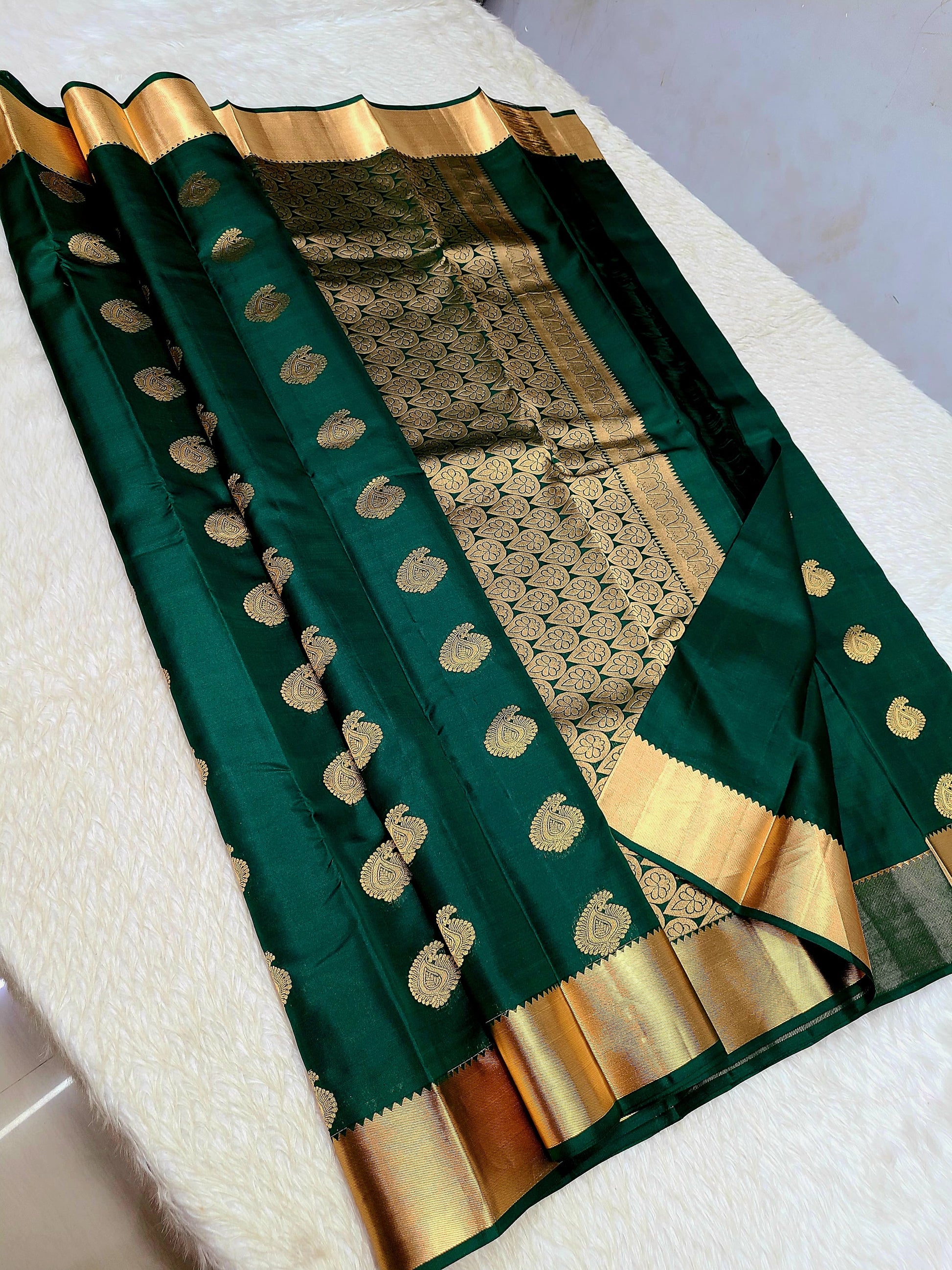 A drape of distinction, this pure silk Kanjivaram saree is adorned with traditional motifs that reflect centuries of weaving heritage