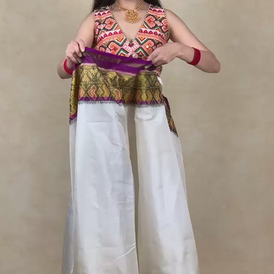 Dry clean only. To protect the delicate threads of the sari, please avoid any pressure on the tips- avoid brush cleaning, or wringing. Iron on medium heat or spread a towel on top of the saree during ironing. Steam iron is recommended. It is ideal to dry clean stained silk sarees immediately. Unfold and change the fold of the silk sarees from time to time. This will help avoid tears and damage along the creases. Store your silk sarees by wrapping them in soft muslin clothes or fabric saree