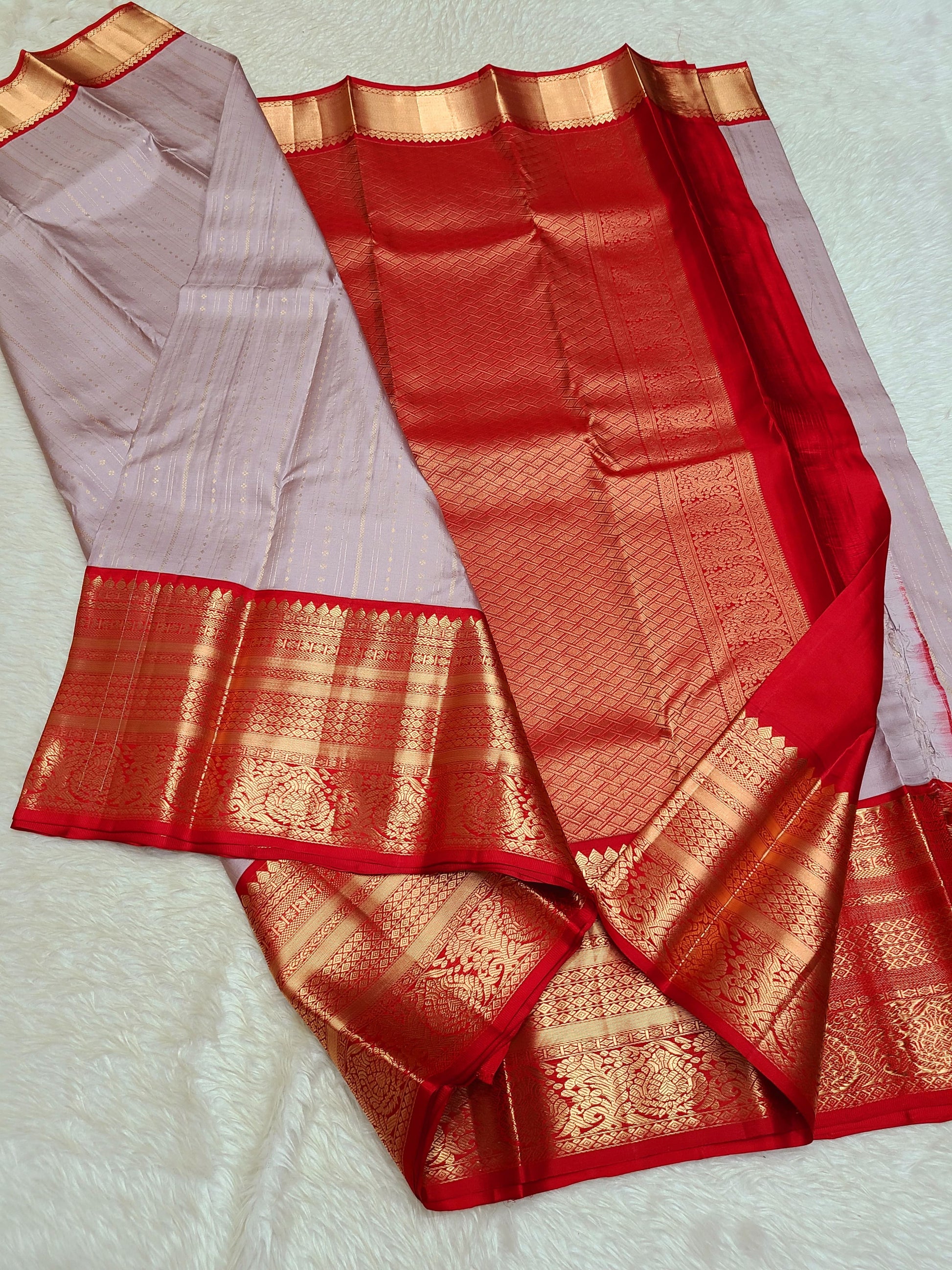 Symbolizing South Indian heritage, this saree’s 1G zari striped body and contrasting korvai border are woven by skilled artisans using age-old temple-inspired techniques.