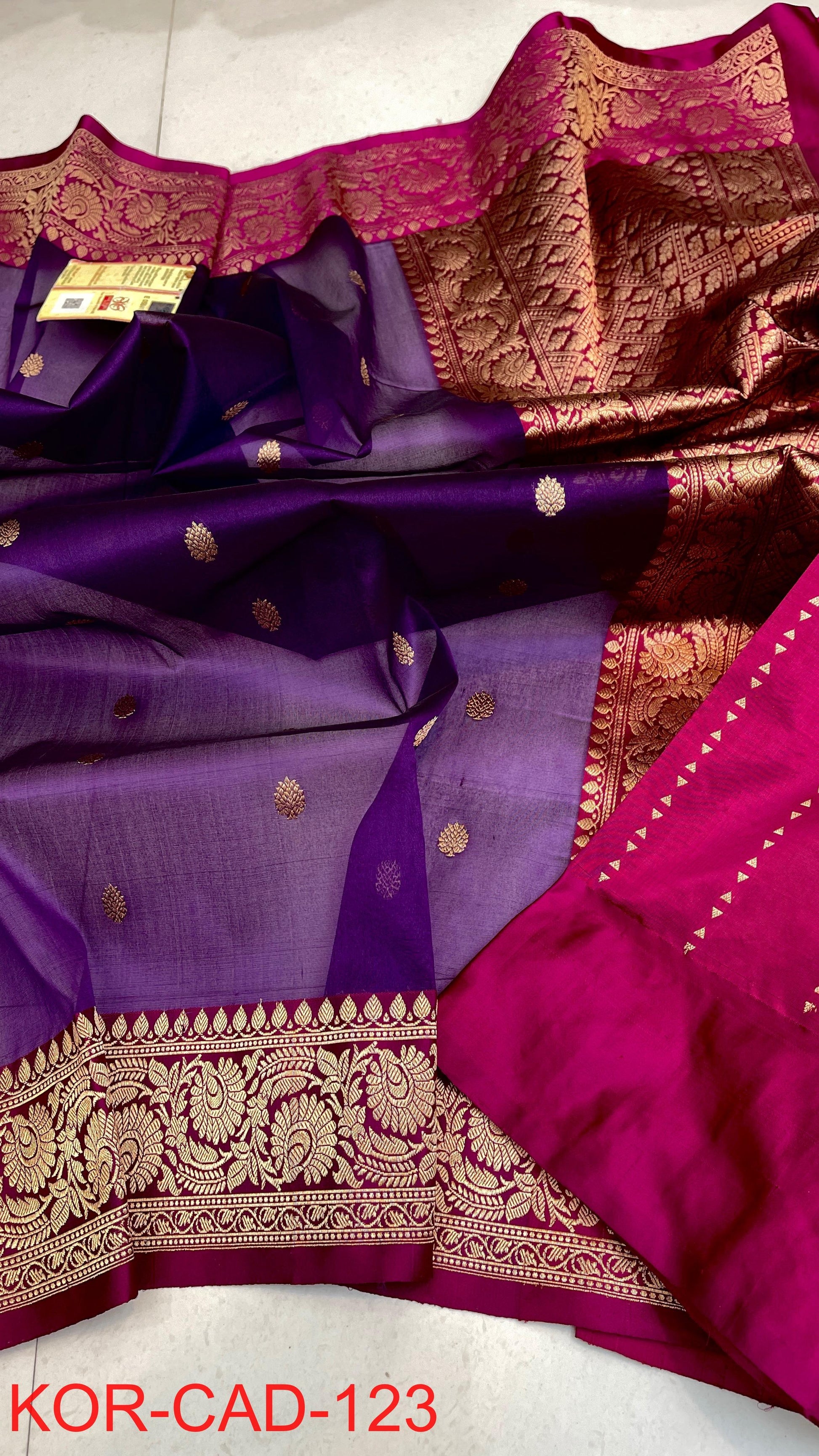Dry clean only. To protect the delicate threads of the sari, please avoid any pressure on the tips- avoid brush cleaning, or wringing. Iron on medium heat or spread a towel on top of the saree during ironing. Steam iron is recommended. It is ideal to dry clean stained silk sarees immediately. Unfold and change the fold of the silk sarees from time to time. This will help avoid tears and damage along the creases. Store your silk sarees by wrapping them in soft muslin clothes or fabric saree