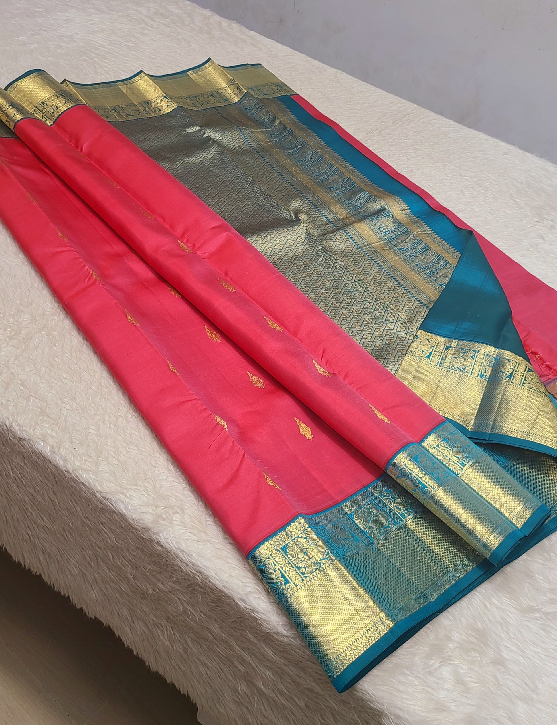 Radiate traditional splendor with this 100% Pure Handwoven Kanchipuram 2G Premium Quality Korvai Traditional Pattern Meenakari Work Buttas Sari. Rich woven pallu and elegant buttas highlighted by 2 Gram Gold Pure Zari Weaving. Silk Mark Certified quality.