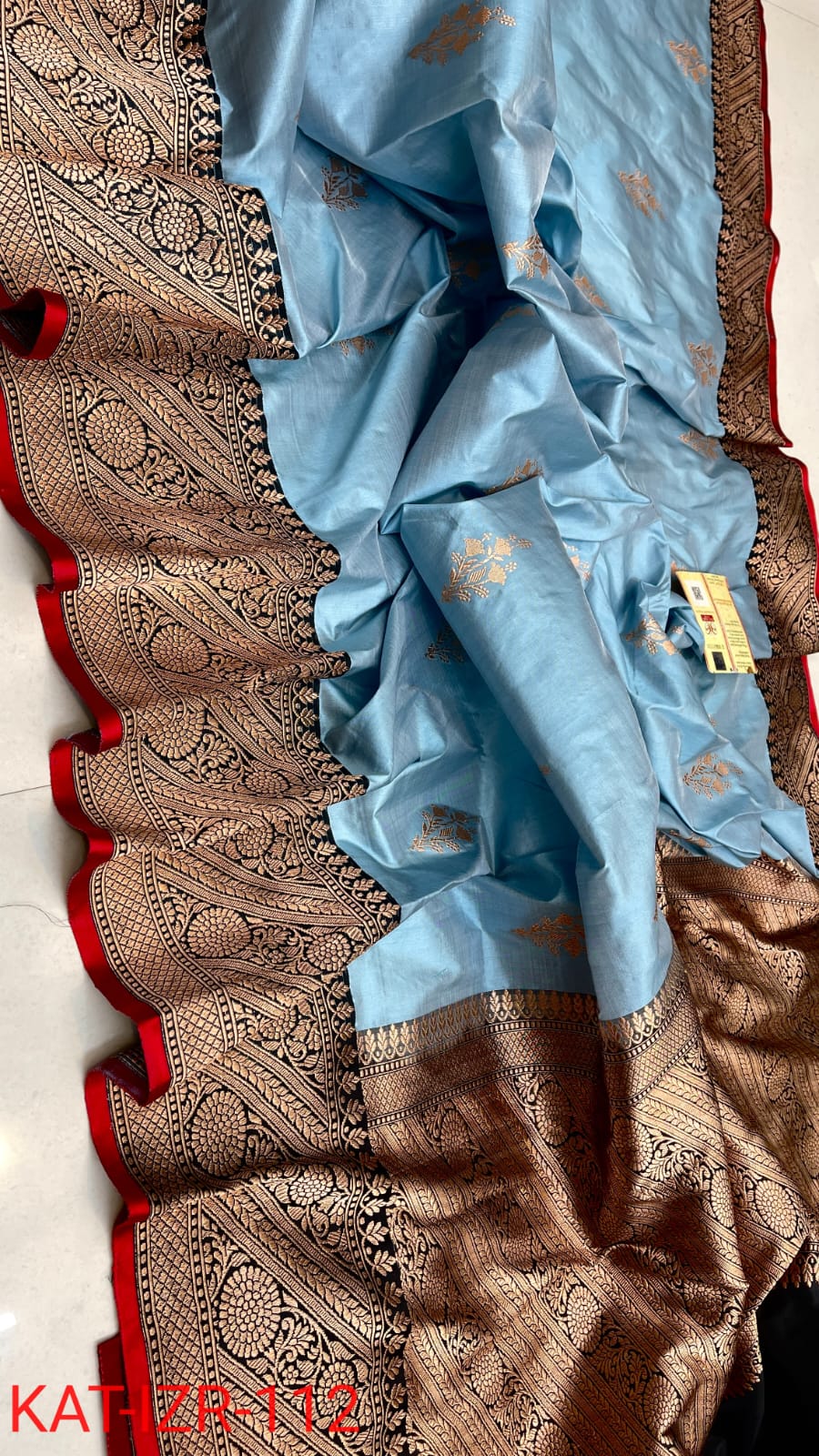 A timeless Katan silk Banarasi saree adorned with shimmering gold zari bels and a contrast blouse piece.