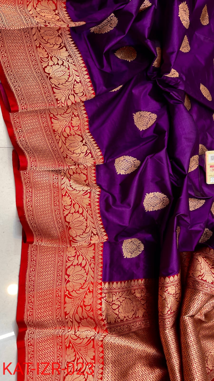 This rich Katan silk drape is adorned with intricately woven meenakari vines for an elegant festive look.