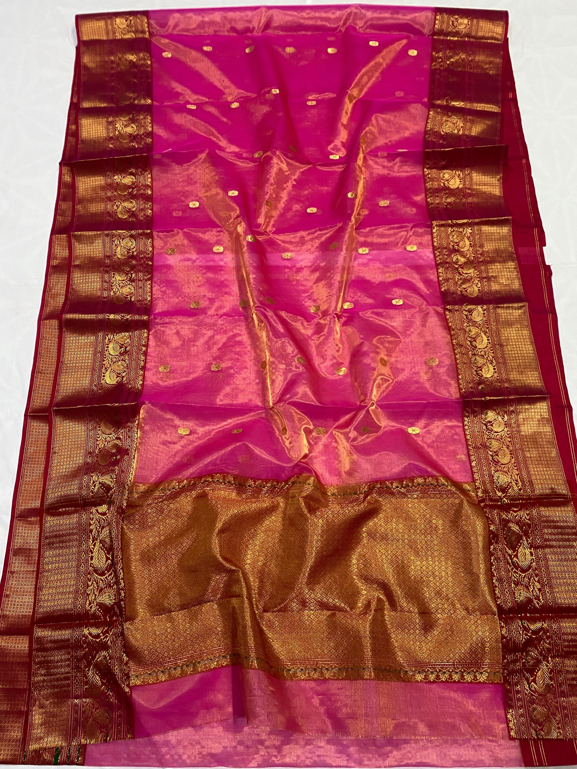 Dry clean only. To protect the delicate threads of the sari, please avoid any pressure on the tips- avoid brush cleaning, or wringing. Iron on medium heat or spread a towel on top of the saree during ironing. Steam iron is recommended. It is ideal to dry clean stained silk sarees immediately. Unfold and change the fold of the silk sarees from time to time. This will help avoid tears and damage along the creases. Store your silk sarees by wrapping them in soft muslin clothes or fabric saree
