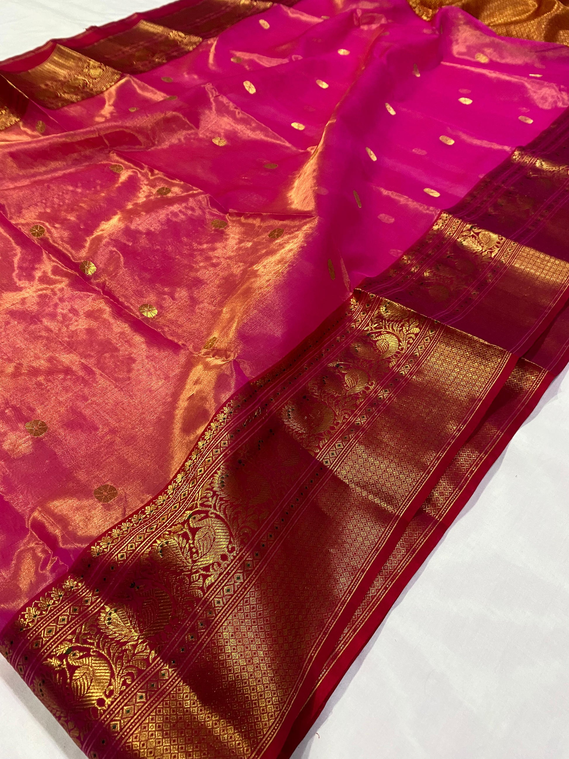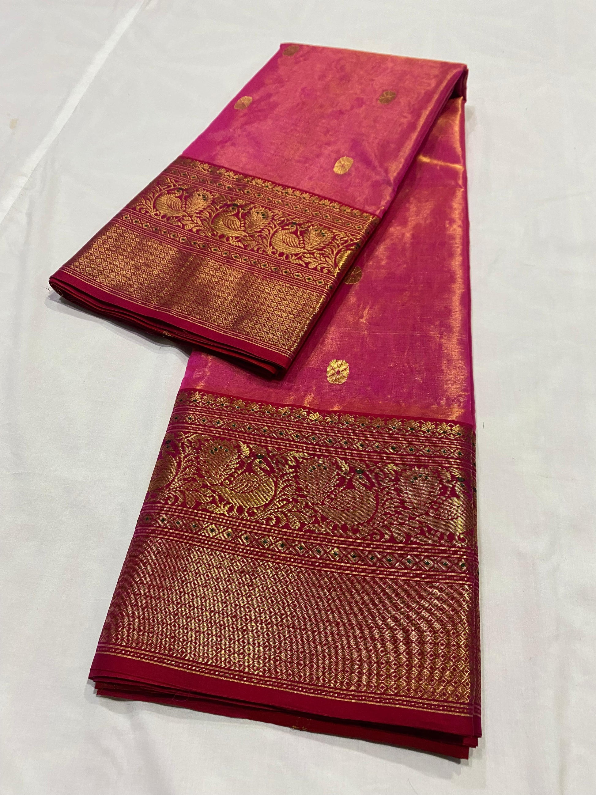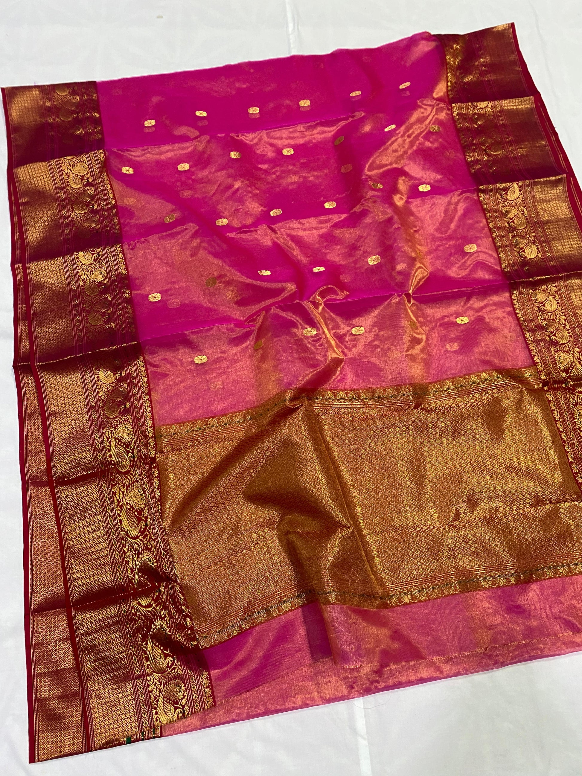 Dry clean only. To protect the delicate threads of the sari, please avoid any pressure on the tips- avoid brush cleaning, or wringing. Iron on medium heat or spread a towel on top of the saree during ironing. Steam iron is recommended. It is ideal to dry clean stained silk sarees immediately. Unfold and change the fold of the silk sarees from time to time. This will help avoid tears and damage along the creases. Store your silk sarees by wrapping them in soft muslin clothes or fabric saree