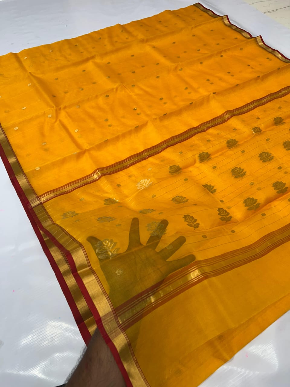 Dry clean only. To protect the delicate threads of the sari, please avoid any pressure on the tips- avoid brush cleaning, or wringing. Iron on medium heat or spread a towel on top of the saree during ironing. Steam iron is recommended. It is ideal to dry clean stained silk sarees immediately. Unfold and change the fold of the silk sarees from time to time. This will help avoid tears and damage along the creases. Store your silk sarees by wrapping them in soft muslin clothes or fabric saree