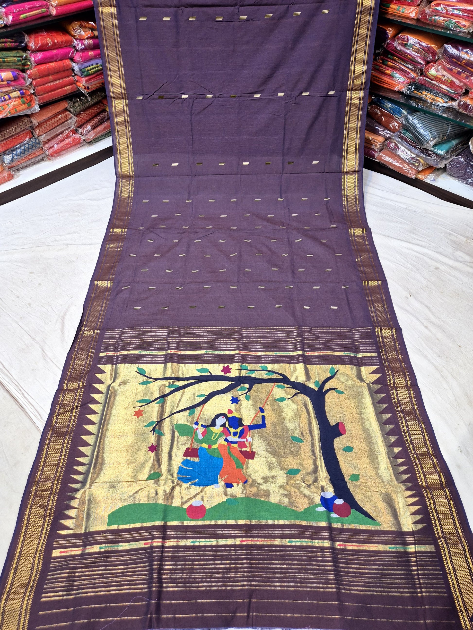 This Cotton Fancy Paithani Saree brings together breathable cotton and intricate handloom detail. The shoulder butta accents and fancy pallu create a statement, finished off with a perfectly matching running blouse.