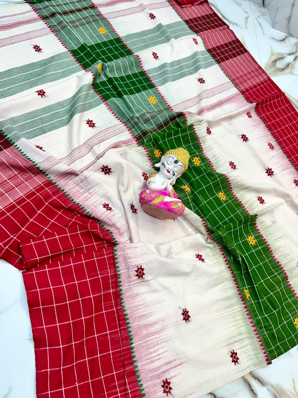 Traditional Dhonekhali cotton saree known for its crisp texture and breezy comfort. A blouse-less drape rooted in Bengal's rich handloom heritage.