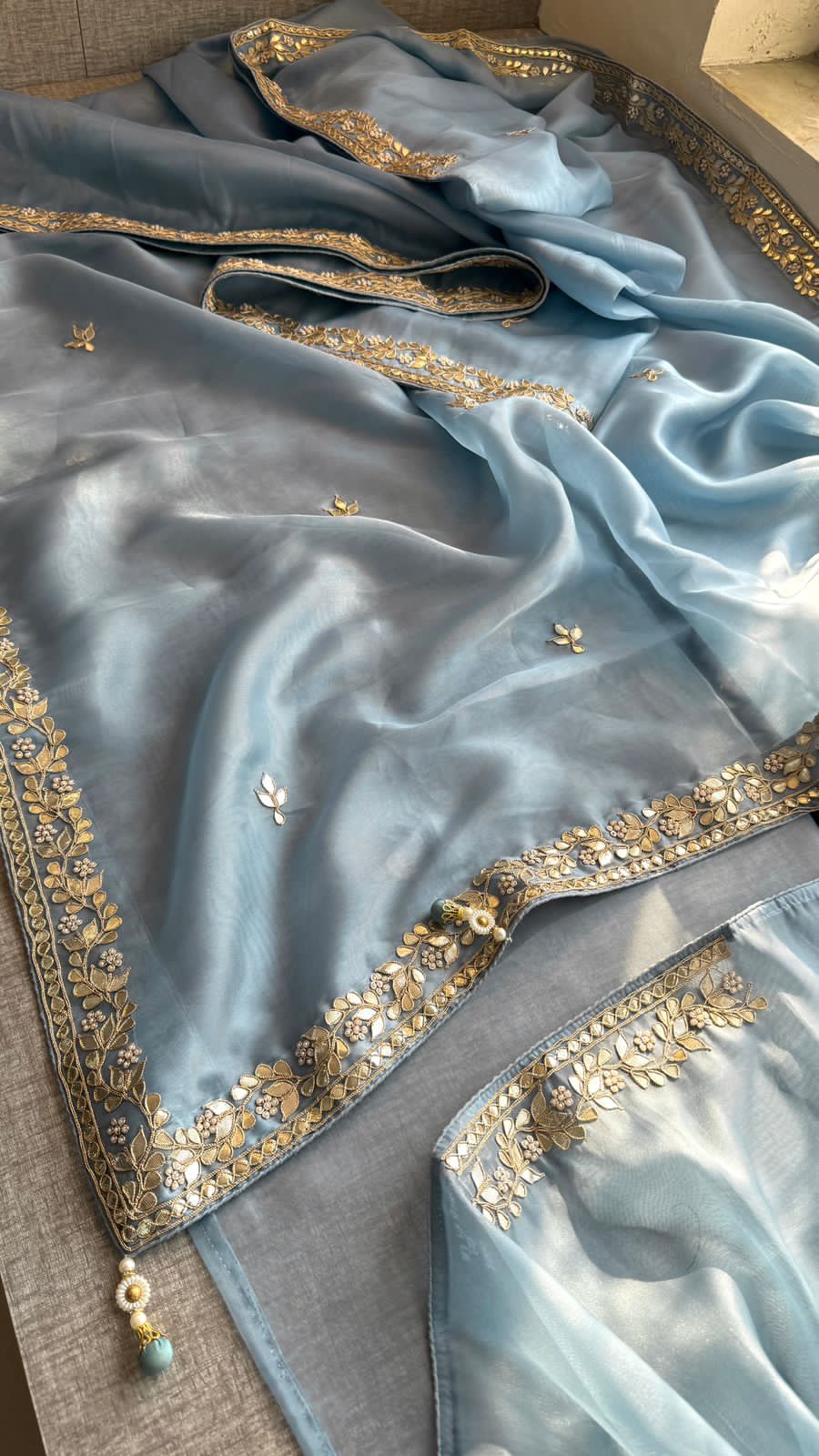 This saree and blouse set is made of pure soft tissue net, adorned with intricate gotapatti, sequins, pearls, and zardozi work. The delicate fabric and exquisite embellishments make this a stunning and elegant choice for any occasion.