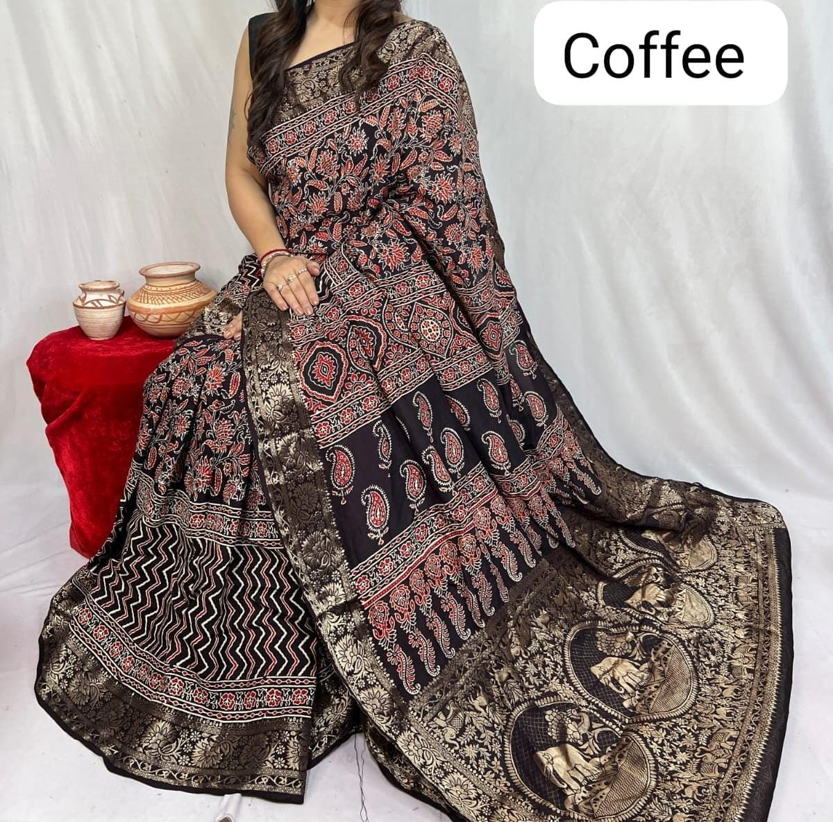 Celebrate craft with this Ajrakh Dola silk saree that weaves in tradition, sustainability, and elegance. With earthy prints made from nature-derived dyes, the saree flows gracefully in 6.5 meters, including a complementary blouse.