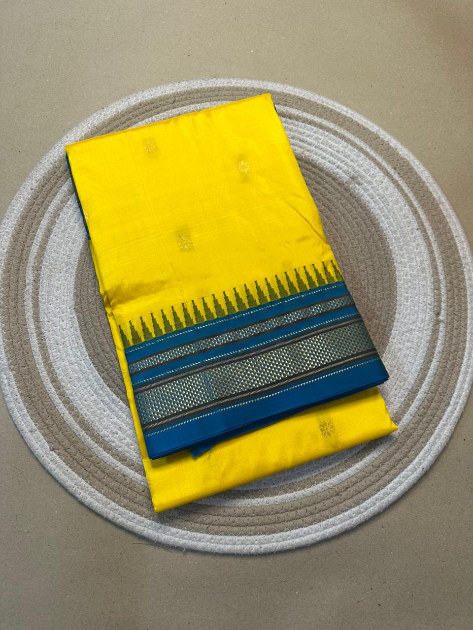 Dry clean only. To protect the delicate threads of the sari, please avoid any pressure on the tips- avoid brush cleaning, or wringing. Iron on medium heat or spread a towel on top of the saree during ironing. Steam iron is recommended. It is ideal to dry clean stained silk sarees immediately. Unfold and change the fold of the silk sarees from time to time. This will help avoid tears and damage along the creases. Store your silk sarees by wrapping them in soft muslin clothes or fabric saree
