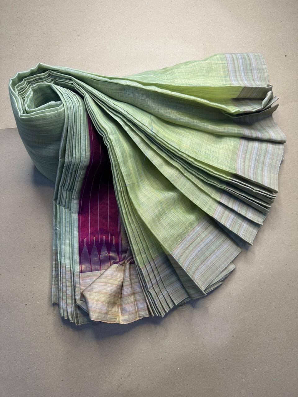 Dry clean only. To protect the delicate threads of the sari, please avoid any pressure on the tips- avoid brush cleaning, or wringing. Iron on medium heat or spread a towel on top of the saree during ironing. Steam iron is recommended. It is ideal to dry clean stained silk sarees immediately. Unfold and change the fold of the silk sarees from time to time. This will help avoid tears and damage along the creases. Store your silk sarees by wrapping them in soft muslin clothes or fabric saree