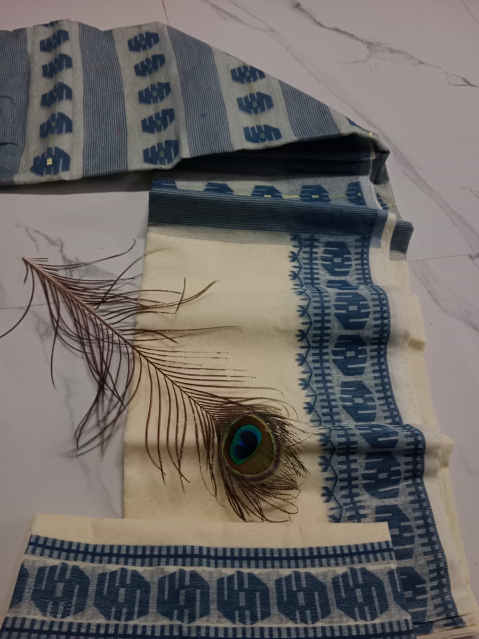 This saree pairs featherlight cotton with delicate Jamdani artistry, making it ideal for understated festive moments.