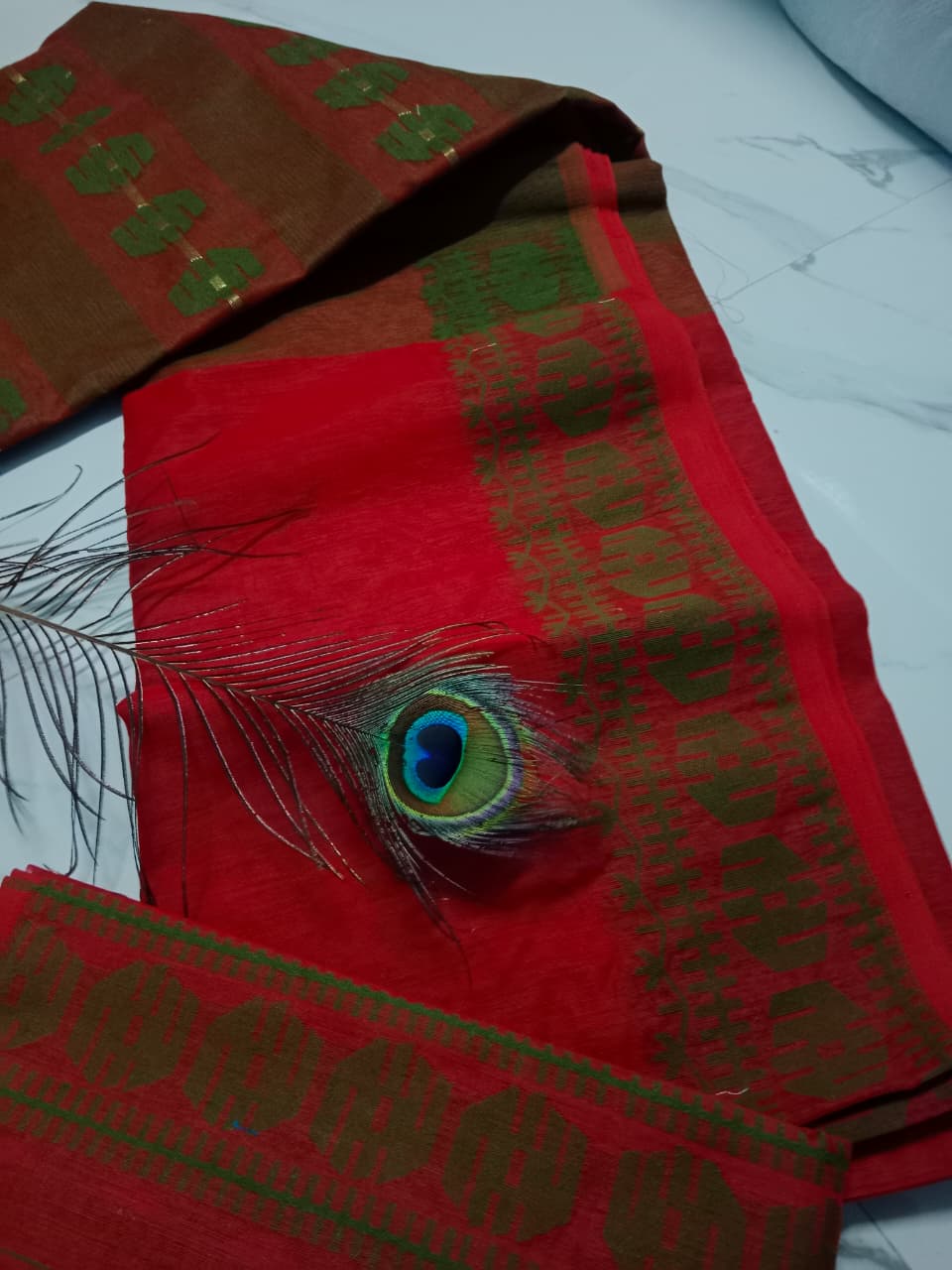 Beautifully woven Jamdani patterns adorn this soft cotton drape, adding charm to every fold and pleat.