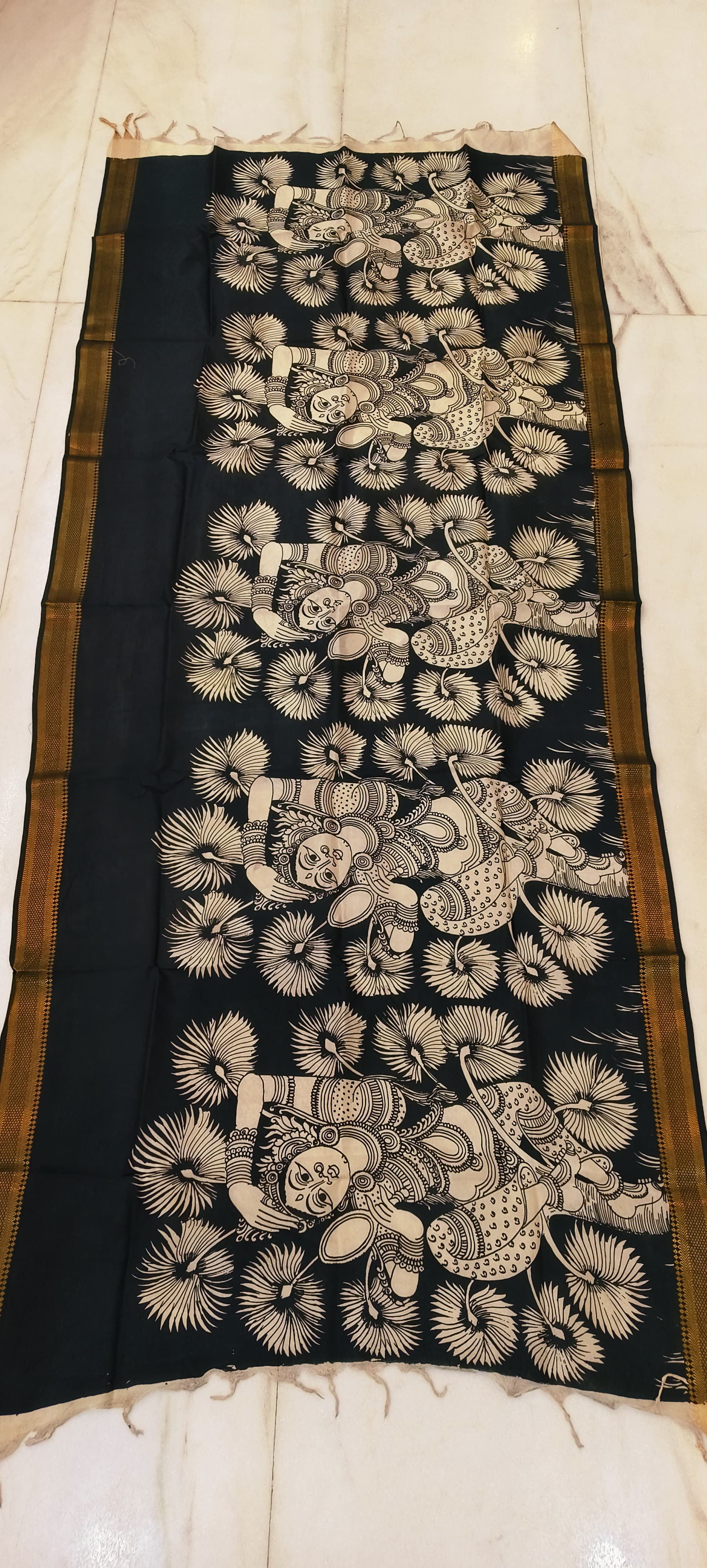 This black-and-white Kalamkari dupatta features intricate hand-drawn motifs, creating a timeless monochrome elegance perfect for both festive and formal occasions.