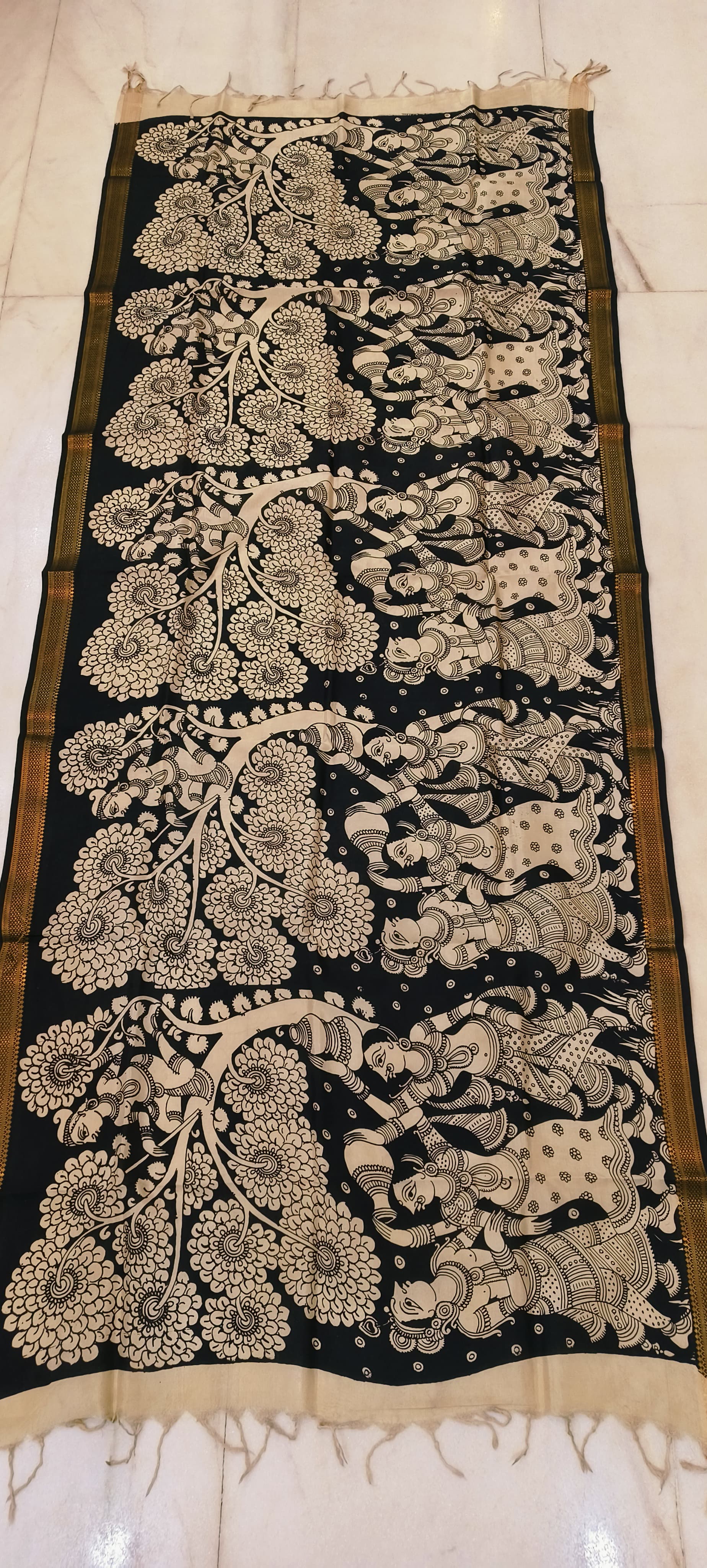 This black-and-white Kalamkari dupatta features intricate hand-drawn motifs, creating a timeless monochrome elegance perfect for both festive and formal occasions.