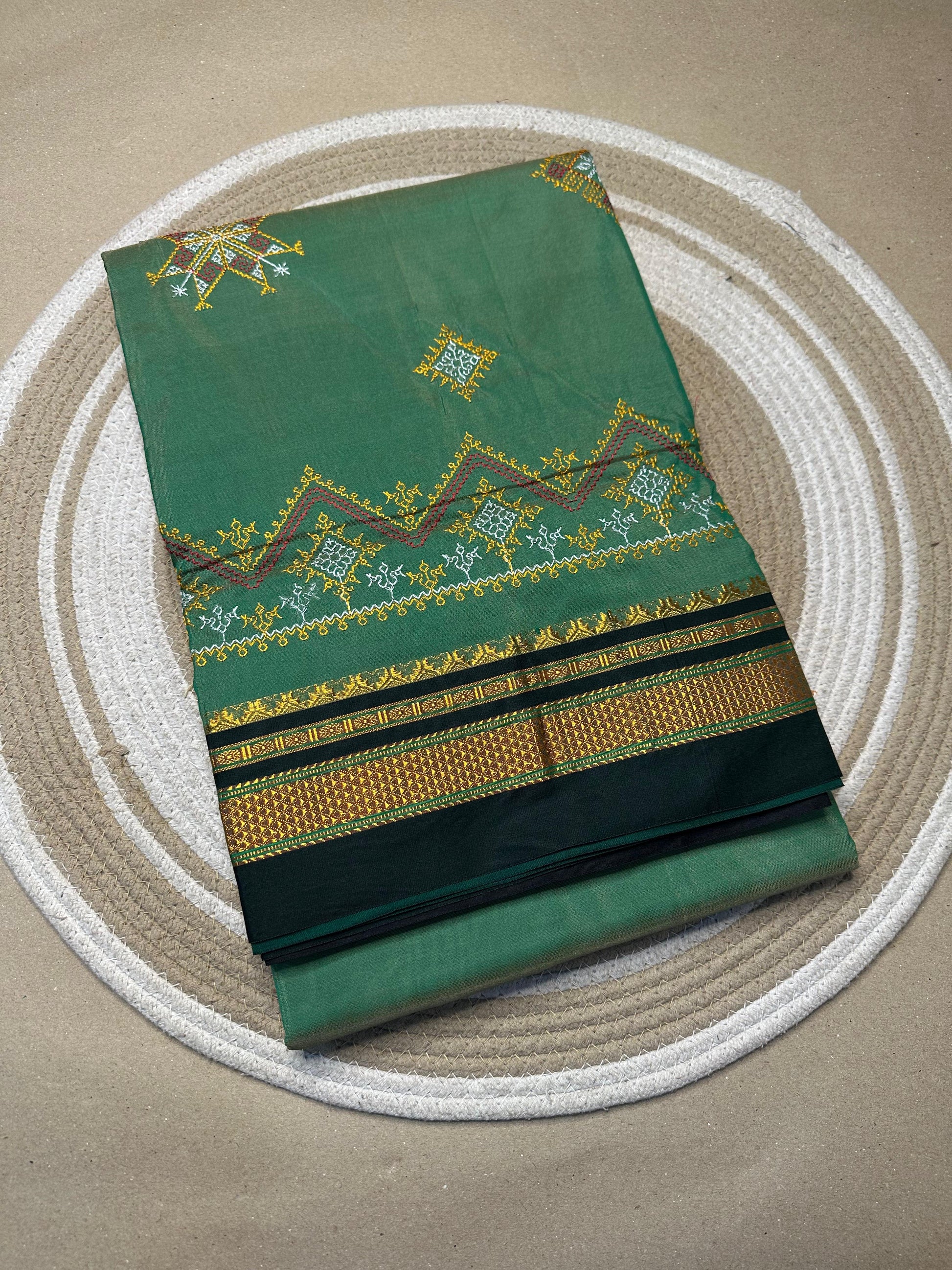 An elegant saree that celebrates heritage embroidery on a contemporary mercerised cotton fabric.