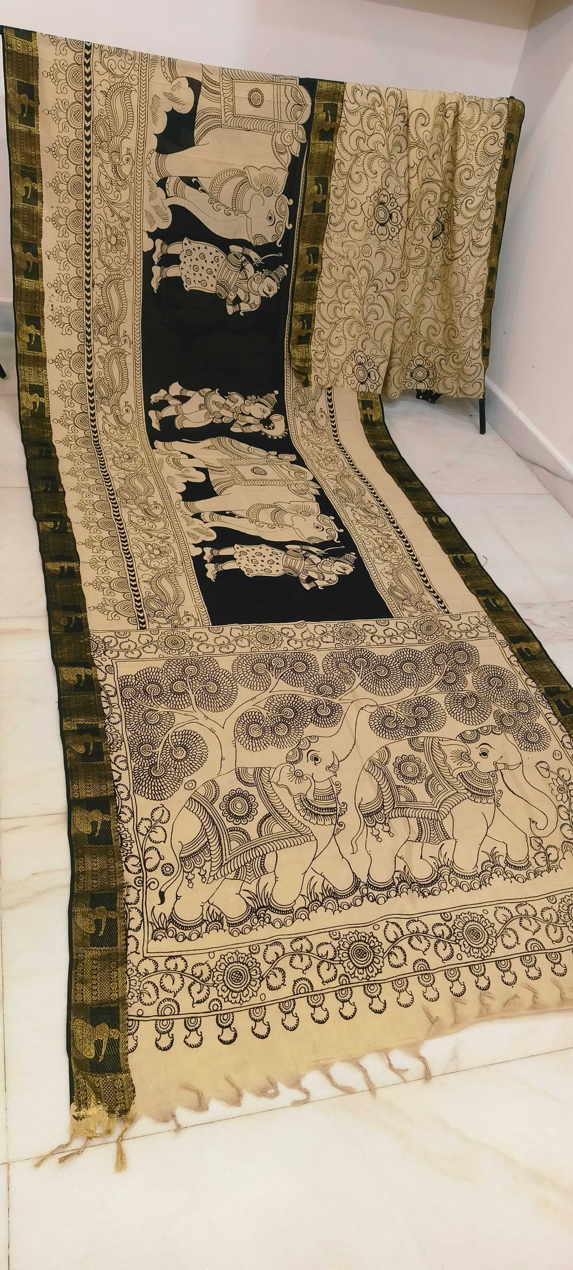 A perfect choice for cultural events, this saree highlights fine brushwork and monochrome storytelling art.