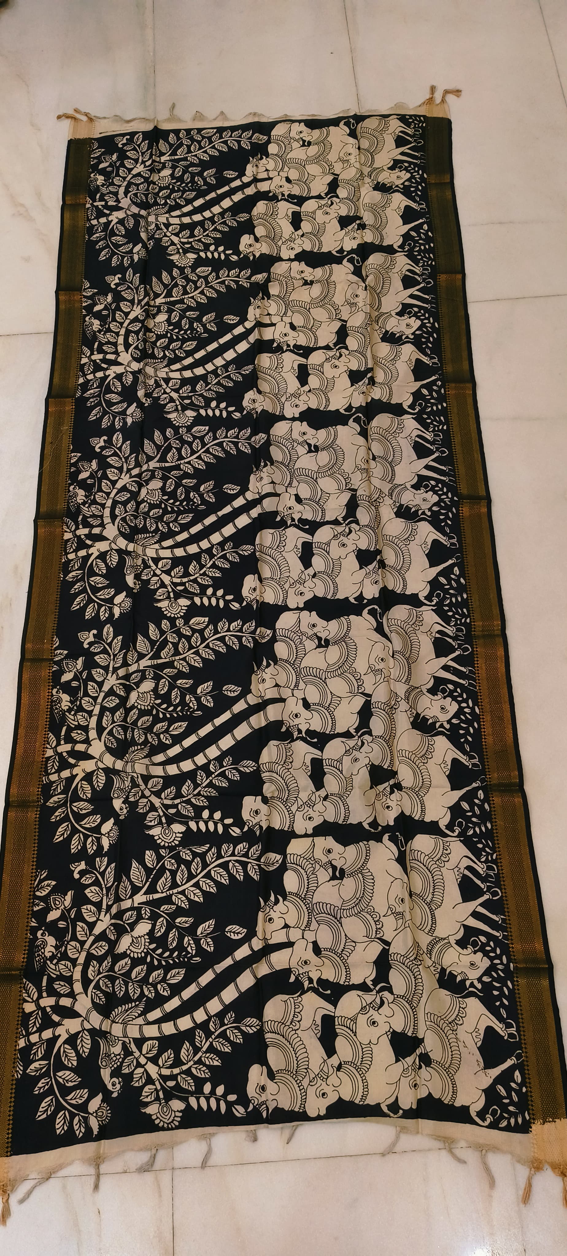 This black-and-white Kalamkari dupatta features intricate hand-drawn motifs, creating a timeless monochrome elegance perfect for both festive and formal occasions.