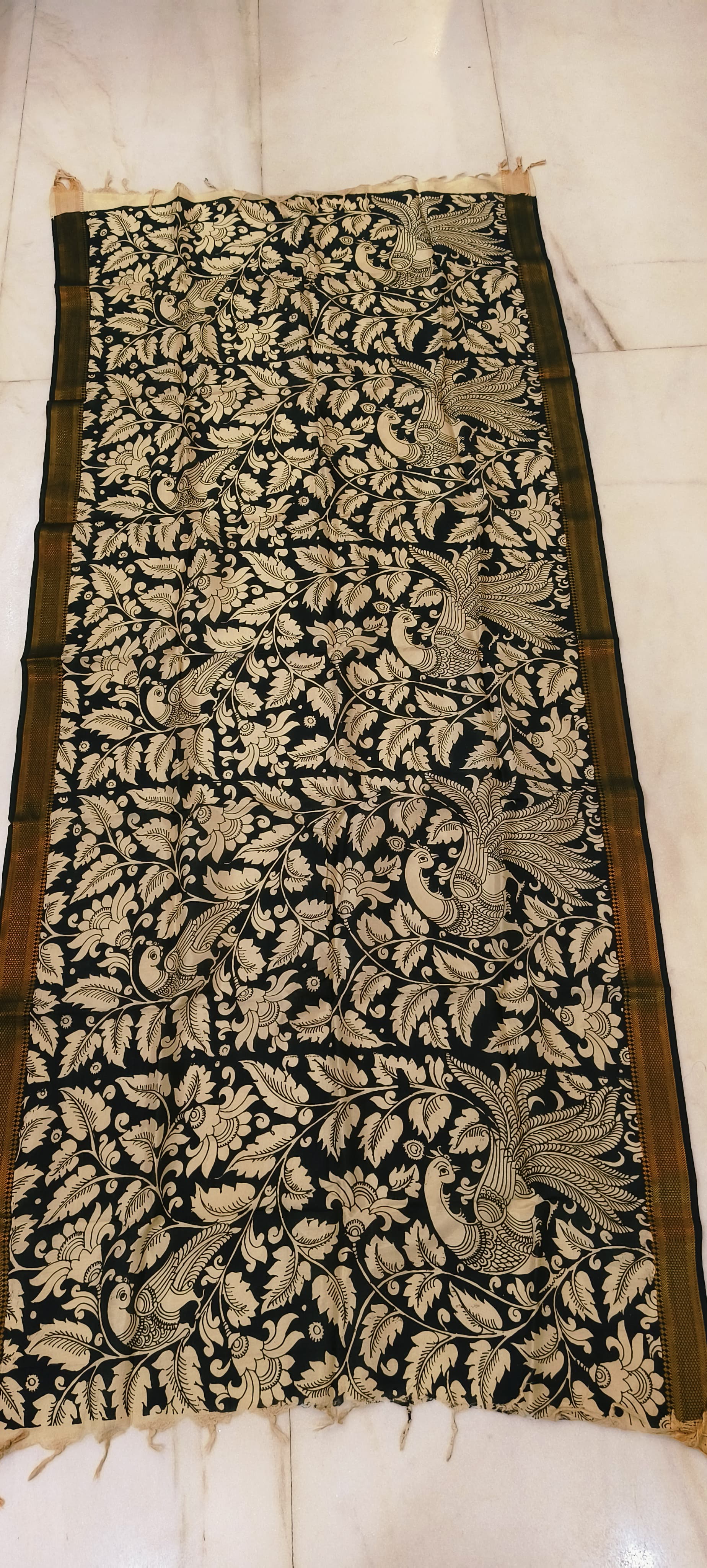 This black-and-white Kalamkari dupatta features intricate hand-drawn motifs, creating a timeless monochrome elegance perfect for both festive and formal occasions.
