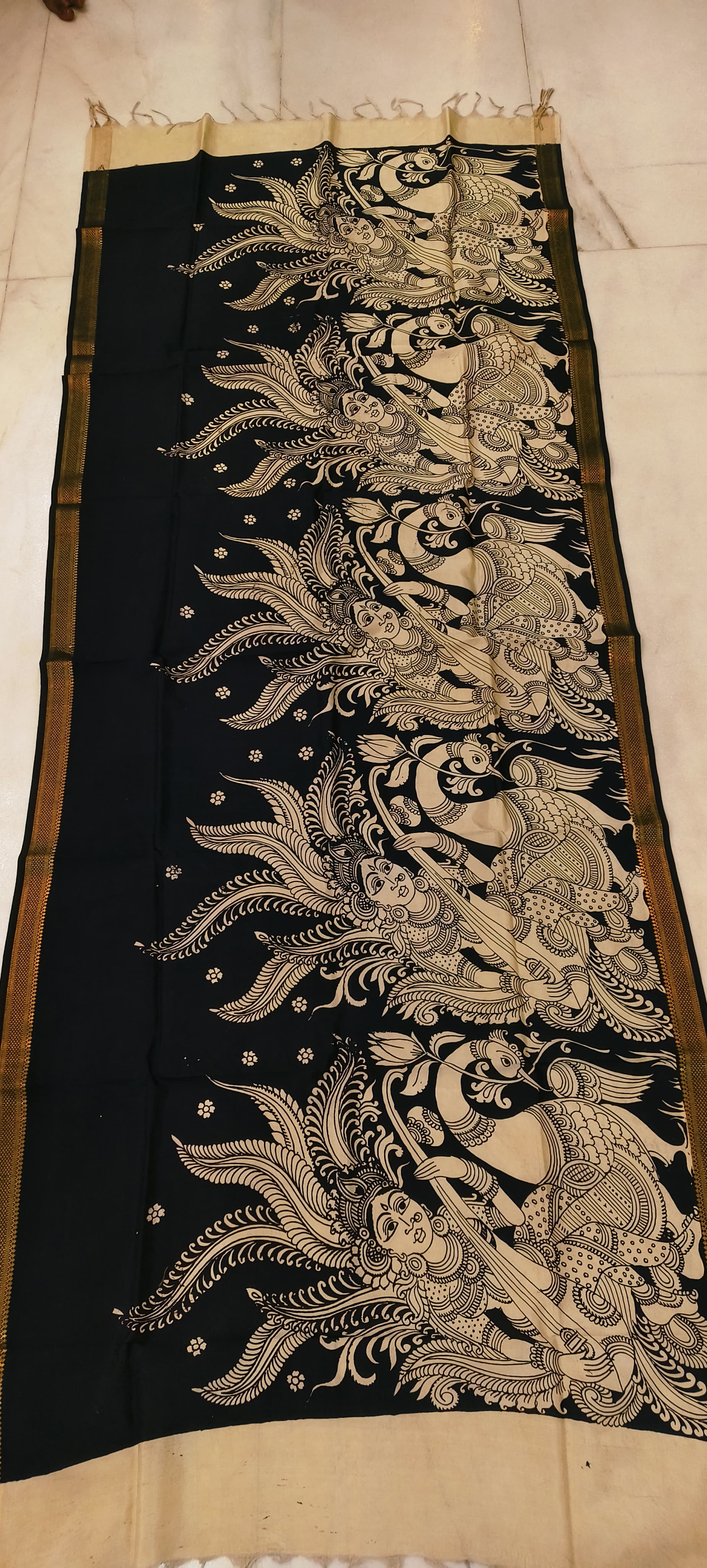 This black-and-white Kalamkari dupatta offers a timeless aesthetic through its elegant pen-drawn motifs and naturally dyed detailing—perfect for any occasion.