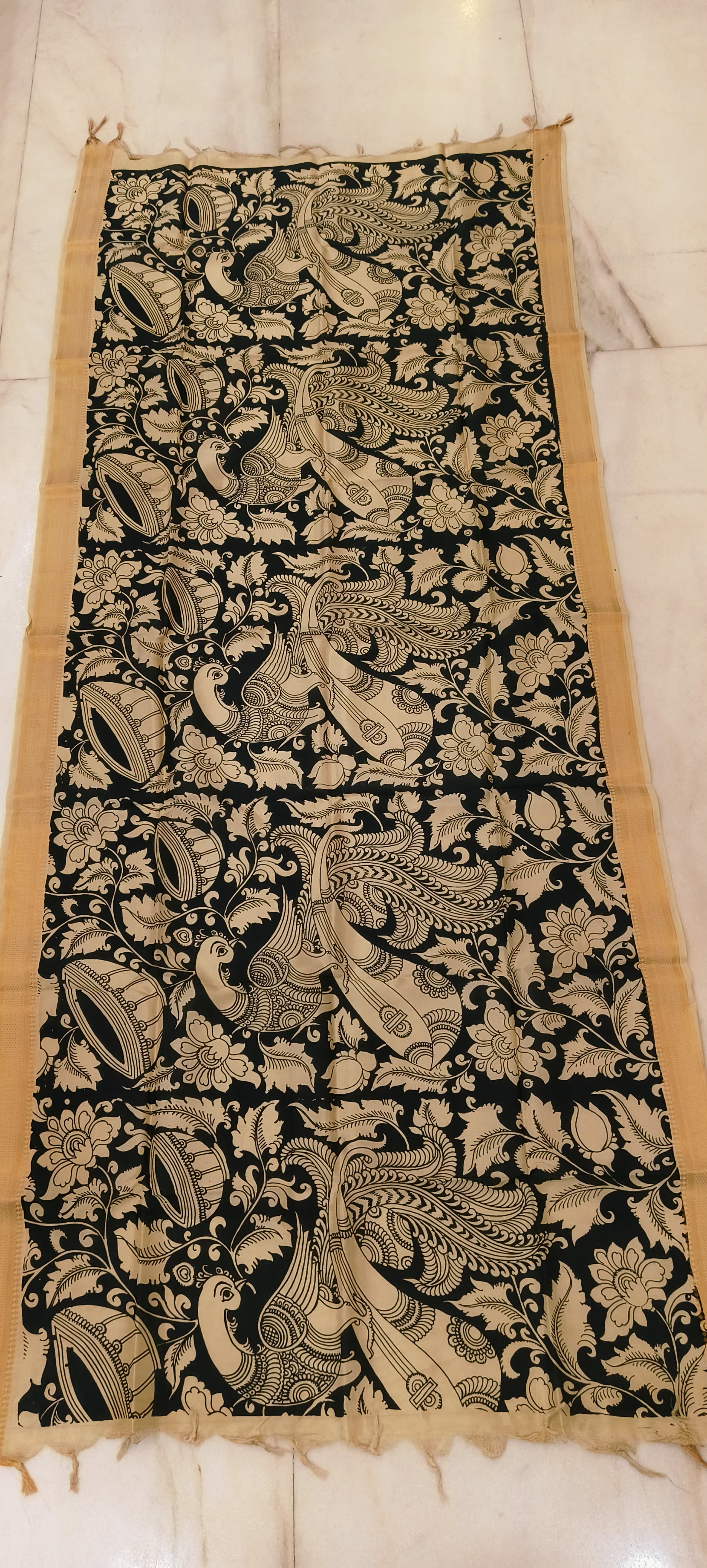 This black-and-white Kalamkari dupatta features intricate hand-drawn motifs, creating a timeless monochrome elegance perfect for both festive and formal occasions.