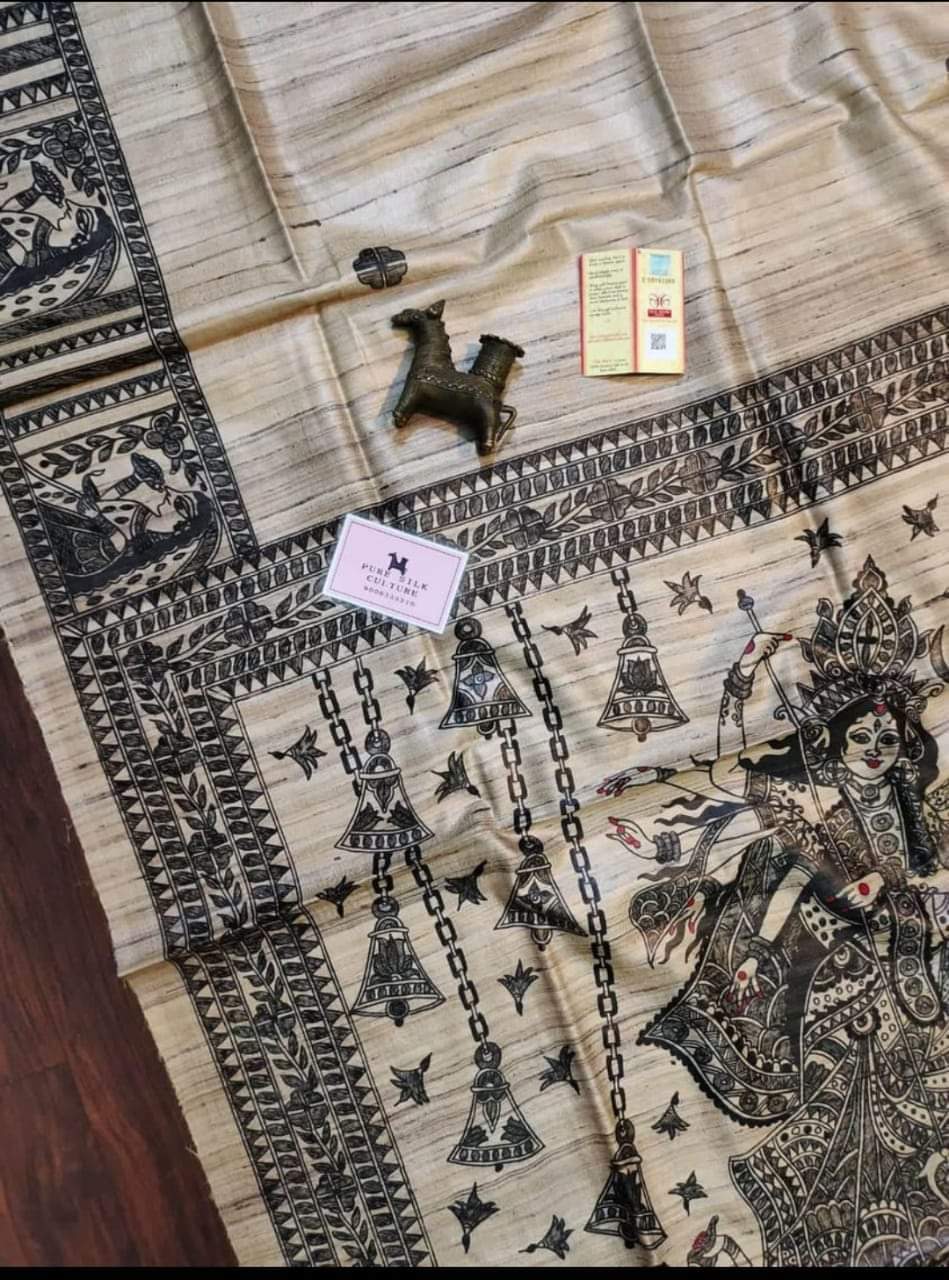This pure Tussar Ghicha silk saree brings centuries of artistry to your wardrobe. Handwoven with care and hand-painted in traditional Madhubani style, it spans 6.50 meters with a blouse piece, making it a canvas of cultural storytelling.
