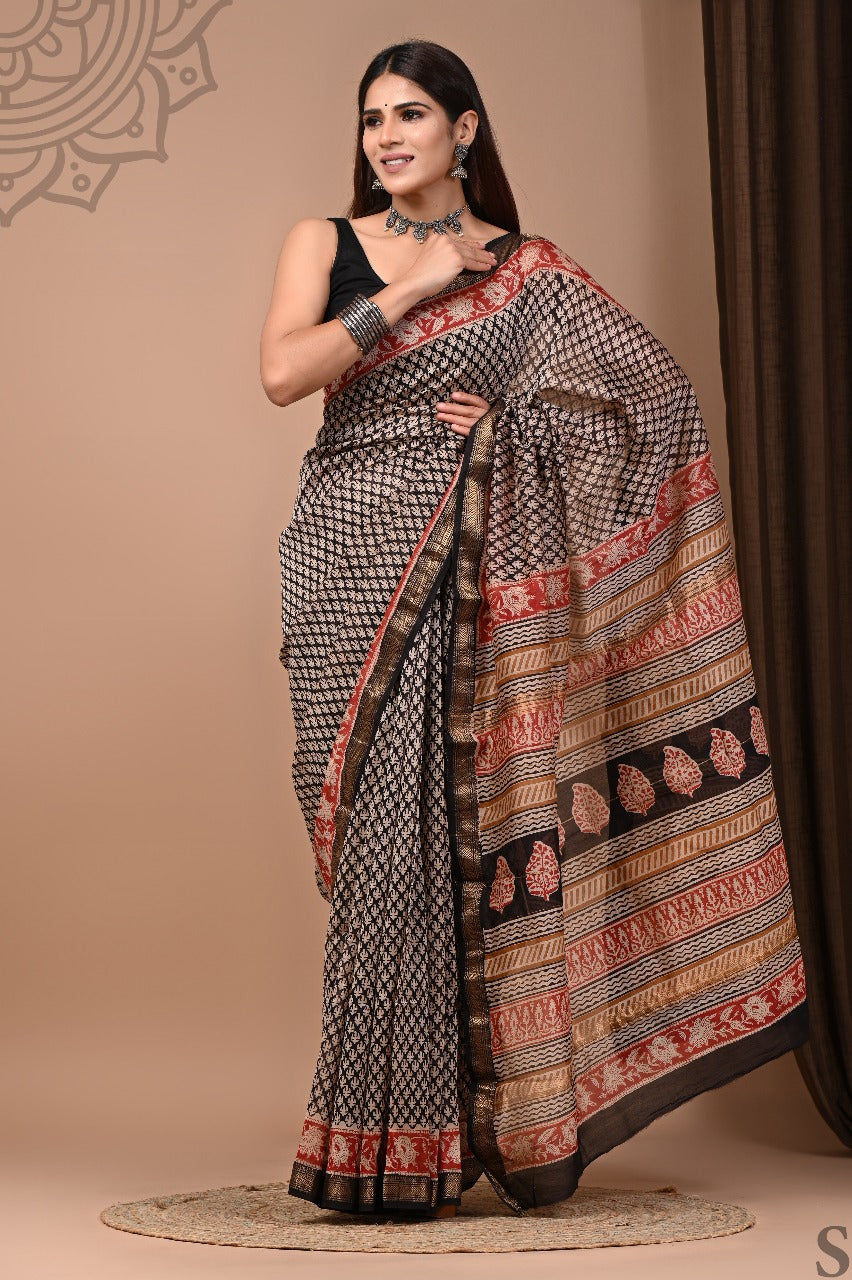 Featuring rich block-printed borders, this saree strikes the perfect festive balance.