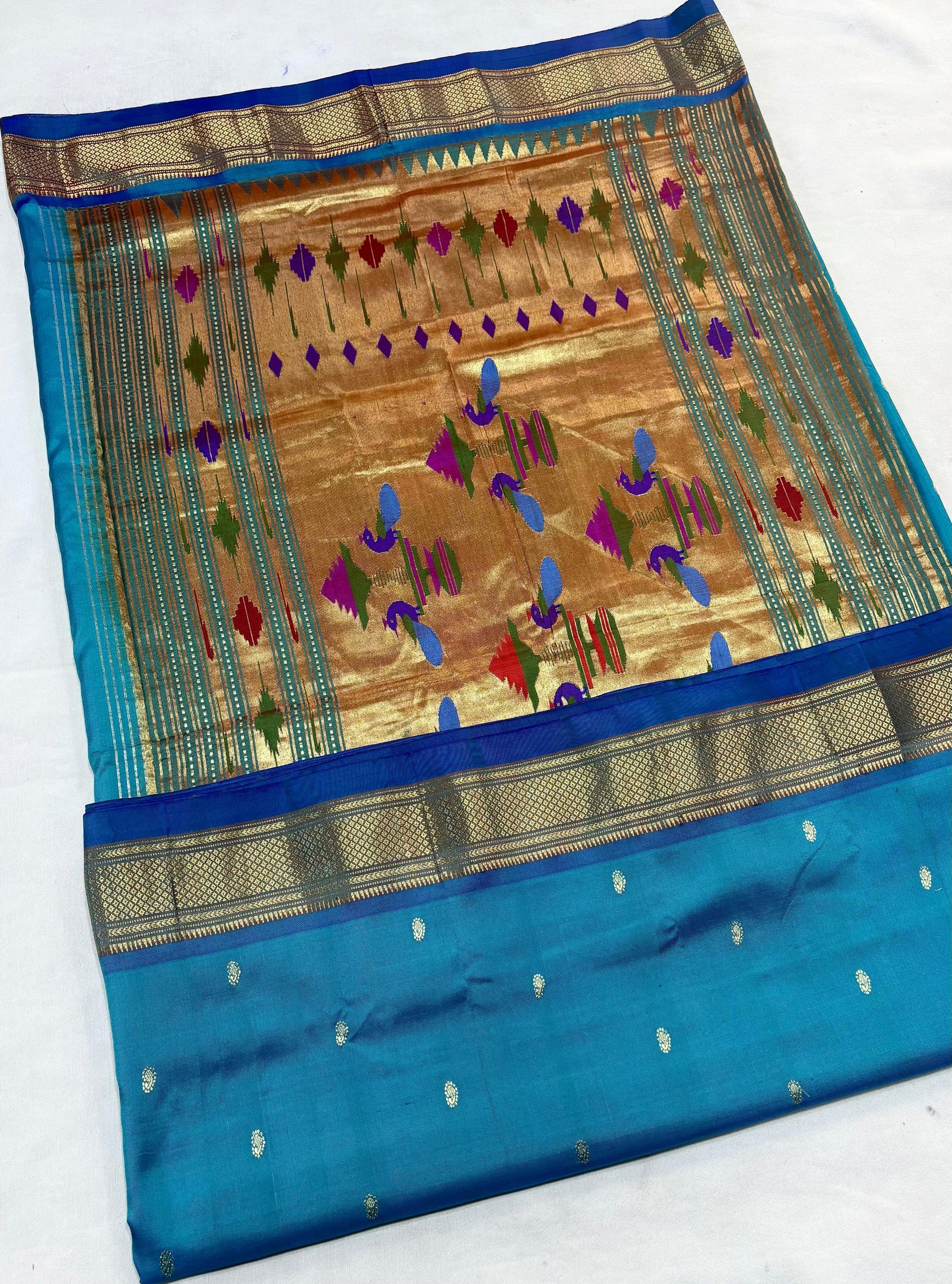 A perfect blend of tradition and luxury, this Yeola Paithani saree showcases fine Mulberry Silk craftsmanship. The stunning golden Narali Border and detailed pallu design make it an ideal choice for grand celebrations.