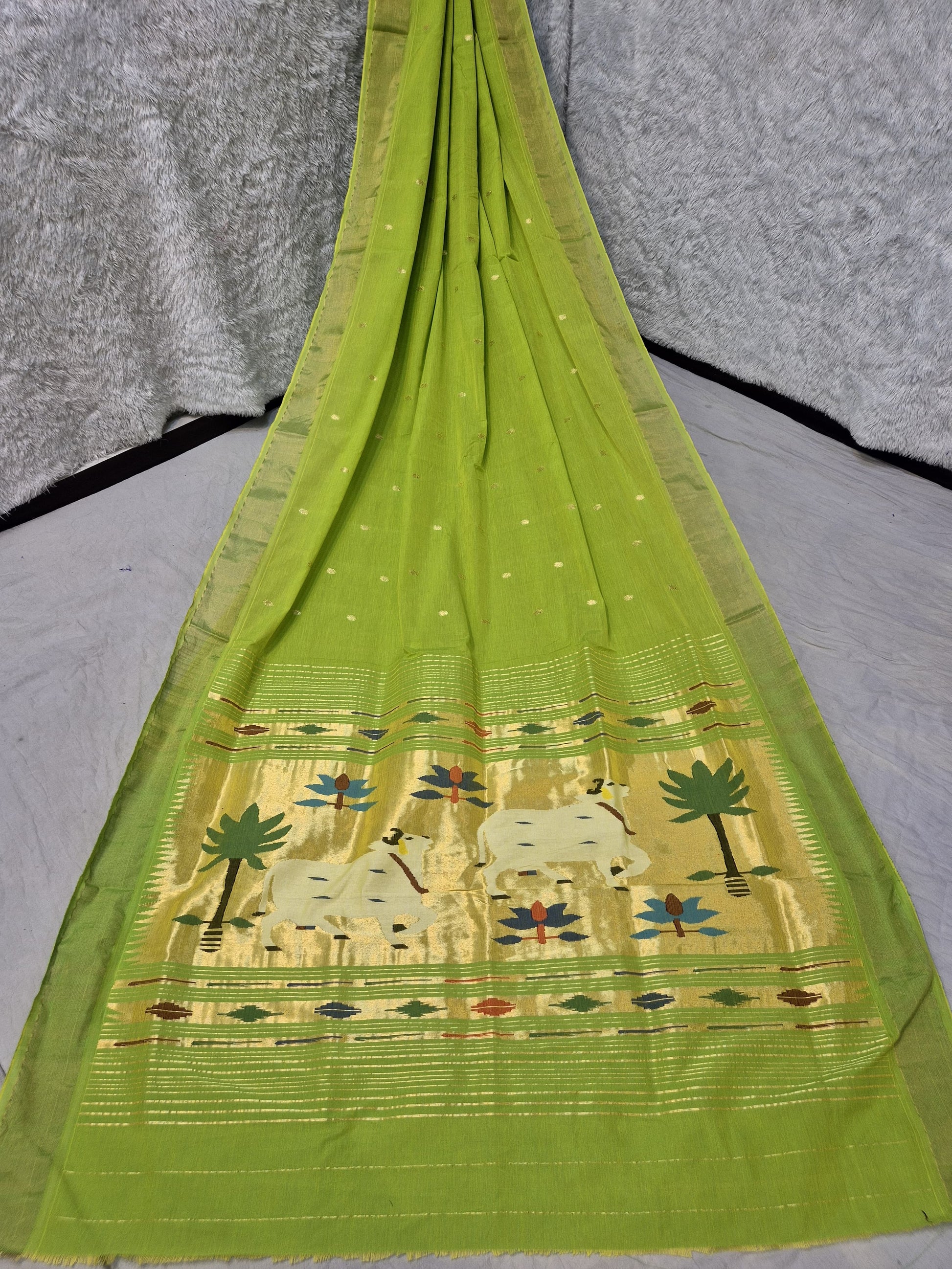Woven with passion and tradition, this Yeola Paithani saree features a luxurious Golden Jari weave and a plain border. The breathable cotton fabric ensures a graceful fall, making it perfect for weddings and festive occasions.