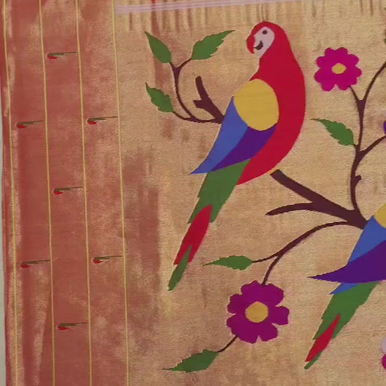 Experience the luxury of pure silk with our pammi Handloom Paithani. The intricate muniya border and shoulder buttis add elegance to this Silkmark certified saree. Handwoven with precision, it also comes with an extra 27" inch blouse for a perfect fit. with gold zari with resham on the borders and pure silk, and weaving on the pallav.