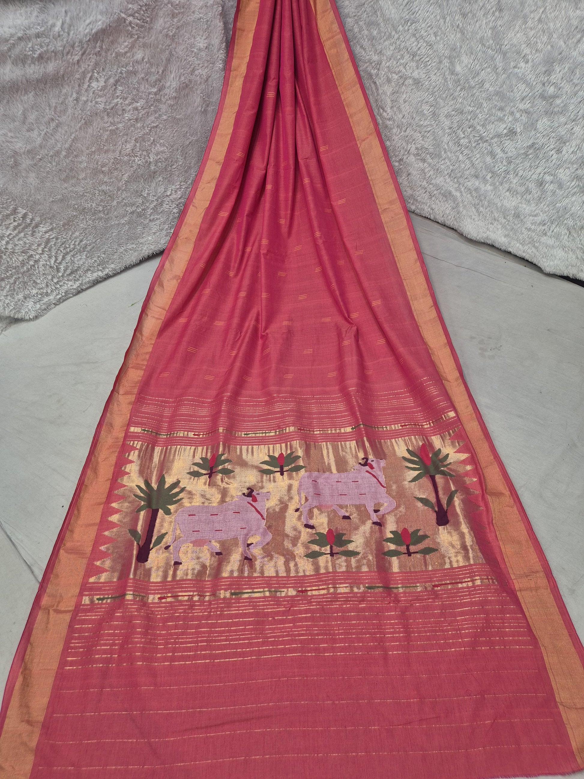 Woven with passion and tradition, this Yeola Paithani saree features a luxurious Golden Jari weave and a plain border. The breathable cotton fabric ensures a graceful fall, making it perfect for weddings and festive occasions.