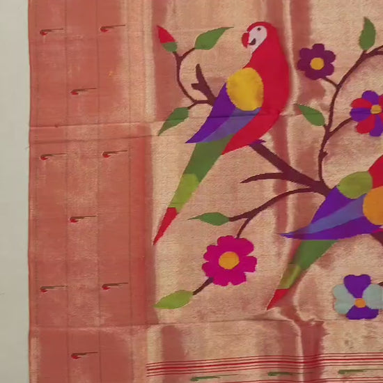 Experience the luxury of pure silk with our pammi Handloom Paithani. The intricate muniya border and shoulder buttis add elegance to this Silkmark certified saree. Handwoven with precision, it also comes with an extra 27" inch blouse for a perfect fit. with gold zari with resham on the borders and pure silk, and weaving on the pallav.