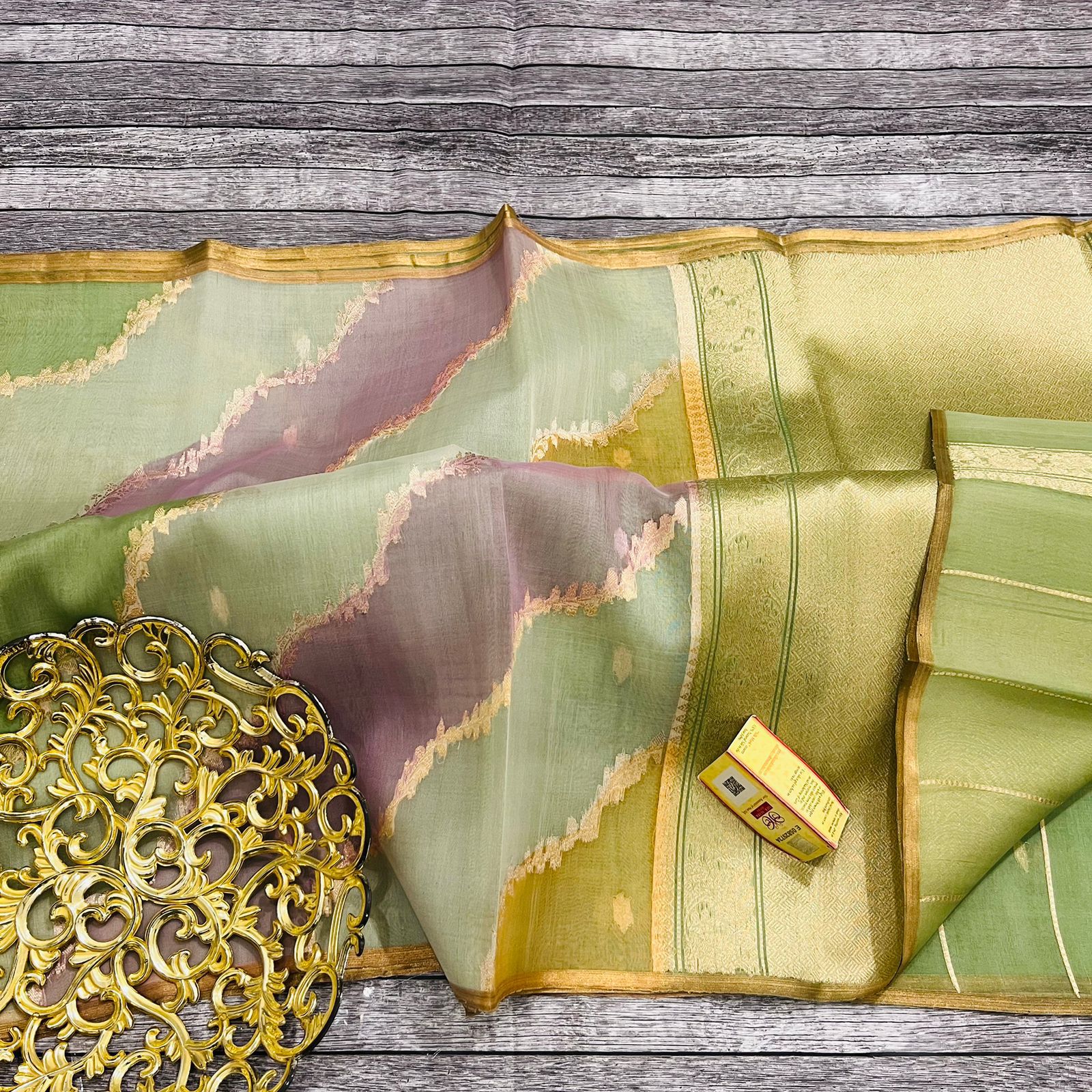 Dry clean only. To protect the delicate threads of the sari, please avoid any pressure on the tips- avoid brush cleaning, or wringing. Iron on medium heat or spread a towel on top of the saree during ironing. Steam iron is recommended. It is ideal to dry clean stained silk sarees immediately. Unfold and change the fold of the silk sarees from time to time. This will help avoid tears and damage along the creases. Store your silk sarees by wrapping them in soft muslin clothes or fabric saree