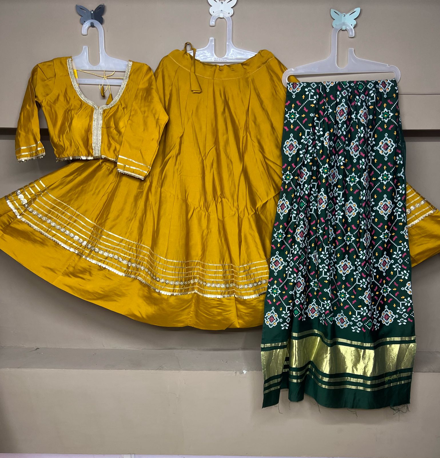 Embrace elegance with the Roman Silk Chaniya Choli, a symbol of tradition and finesse. Made with best finishing and original quality, this set in Dno: Roman 2 comes in all new shades. The chaniya, with a 5-6 meter flare and 42-inch waist, ensures a royal presence. Detailed with heavy gotta and sequins laces, it adds a touch of sparkle. The L-size blouse is designed with a margin for adjustments and double cotton lining for comfort. The chaniya is enhanced with pure crape lining, ensuring a graceful fall. Completing the ensemble is an original semi gajji silk Patola dupatta, adorned with both-side lagdi patta, making it a must-have for festive occasions.