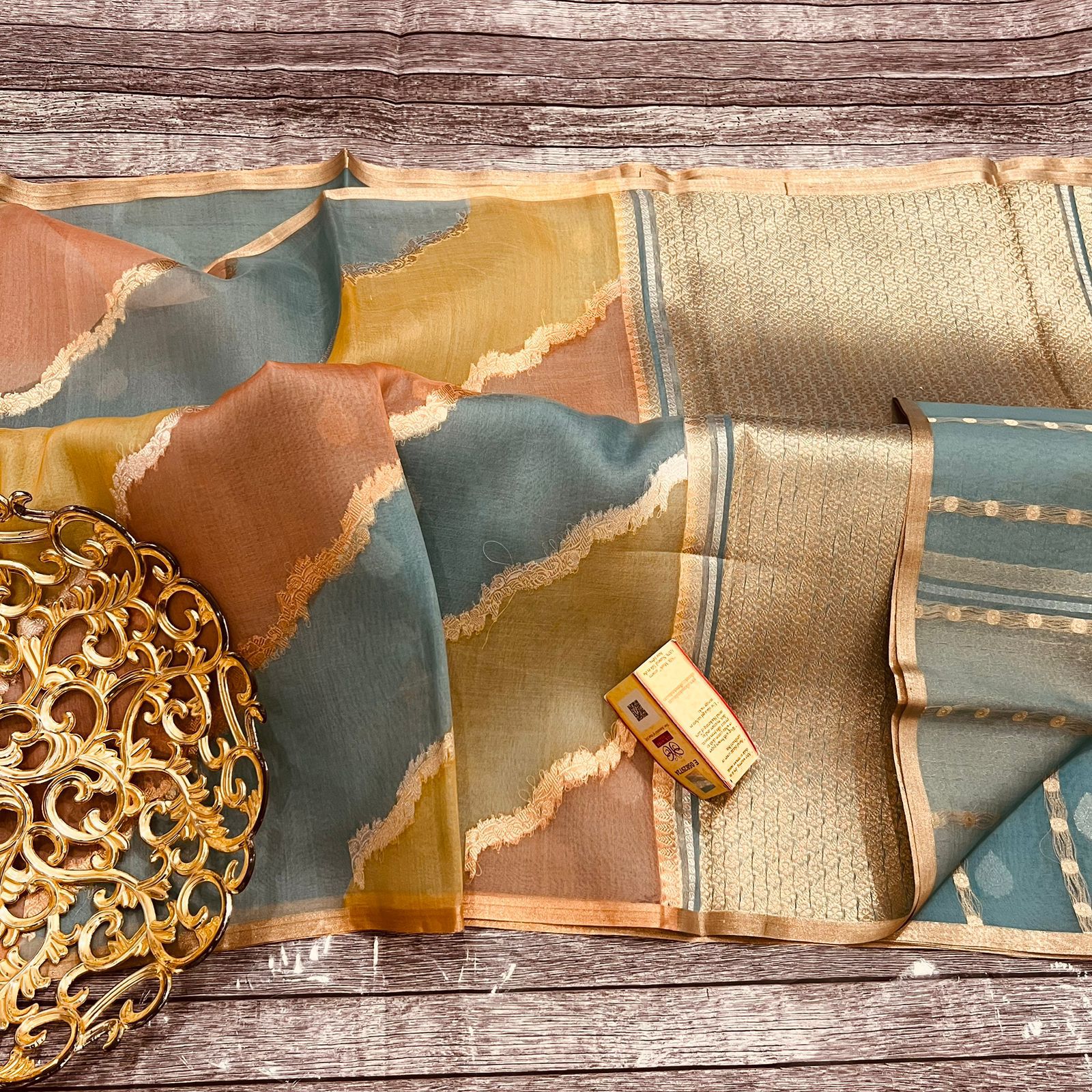This Pure Rangkat Kora Handloom Silk Saree is a masterpiece of craftsmanship, featuring a rich pallu and elegant Aara design. Its airy texture and refined detailing bring regal charm to every step you take.
