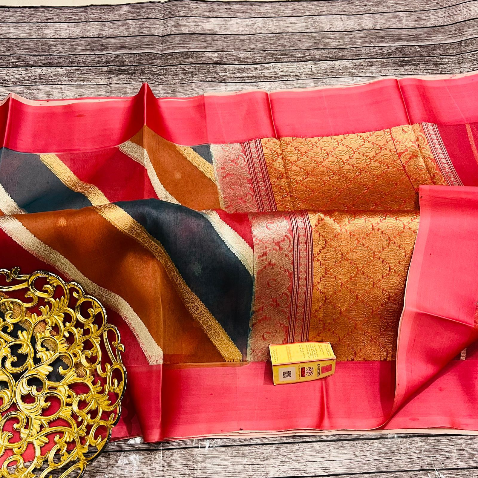 This Pure Rangkat Kora Handloom Silk Saree is a masterpiece of craftsmanship, featuring a rich pallu and elegant Aara design. Its airy texture and refined detailing bring regal charm to every step you take.