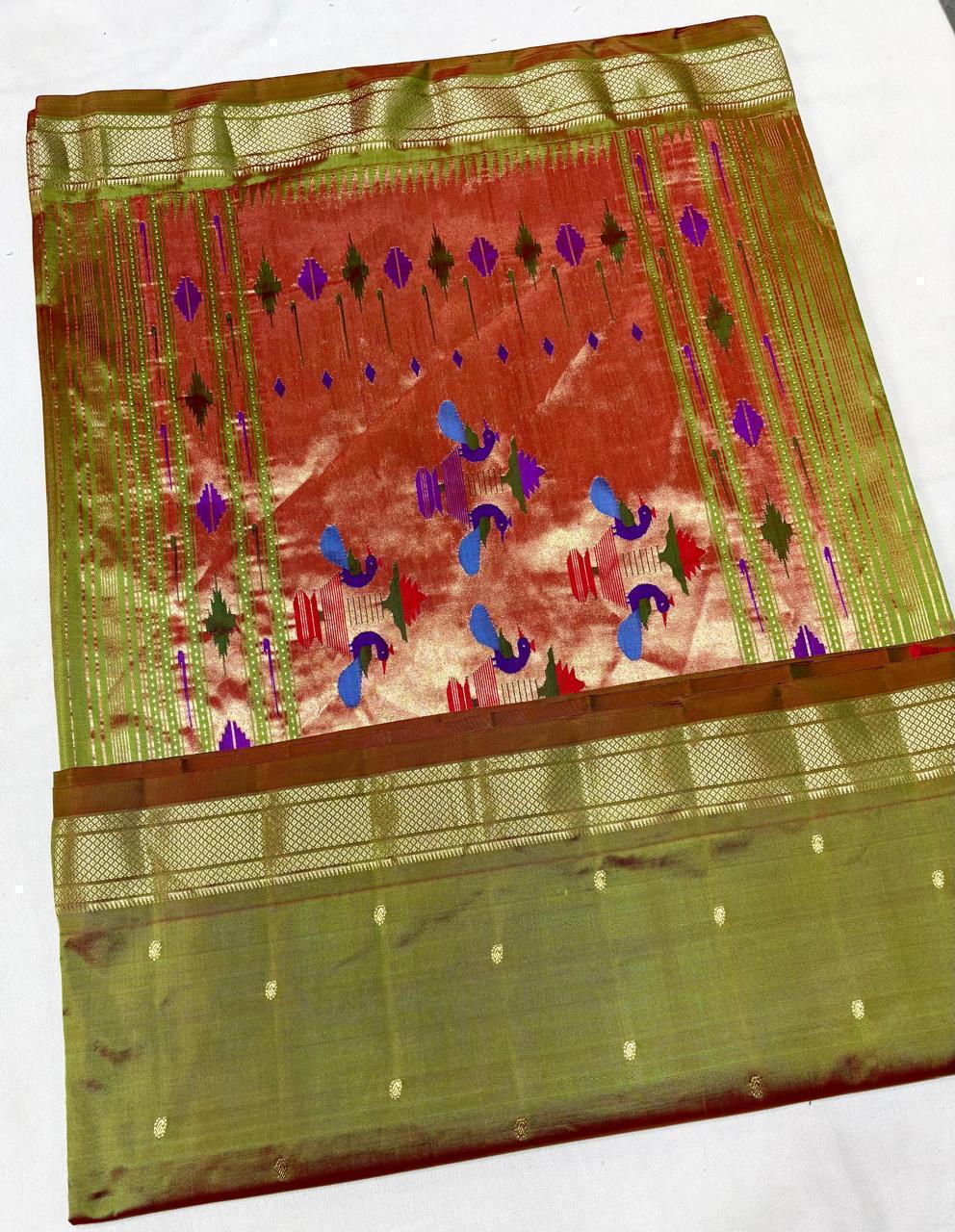 Crafted from pure Mulberry Silk, this Yeola Paithani saree is a true reflection of Indian artistry. The rich Narali Border, detailed traditional pallu, and exquisite Golden Jari make it a symbol of sophistication.