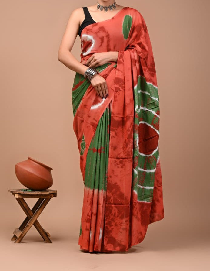 Saree wrapped in Shibori work on cotton channels coastal cool. Wave-like prints flow across each yard. Feel summer vibes all year long.