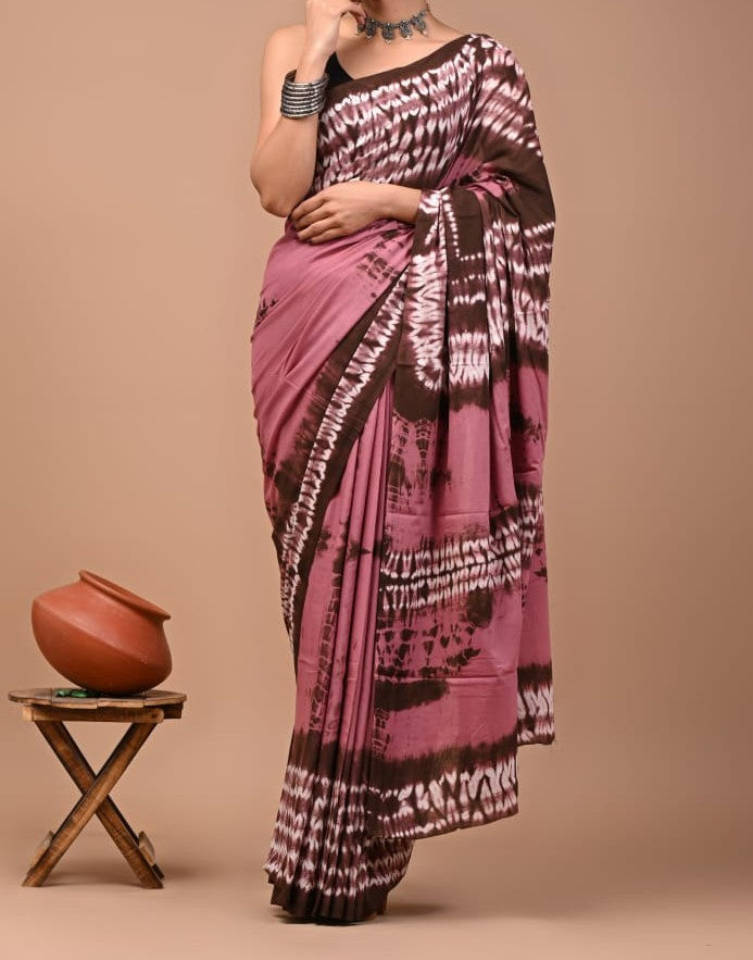 Saree infused with Shibori work on cotton channels artisan passion. Lush whorls of dye pop against breathable fabric. Fashion-forward yet timeless.