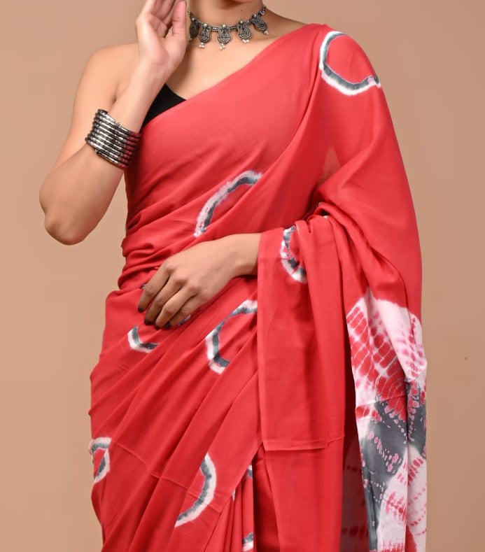 Saree brushed with Shibori work on cotton exudes spontaneous artistry. The airy weave keeps comfort high while patterns keep eyes locked. Make casual days unforgettable.