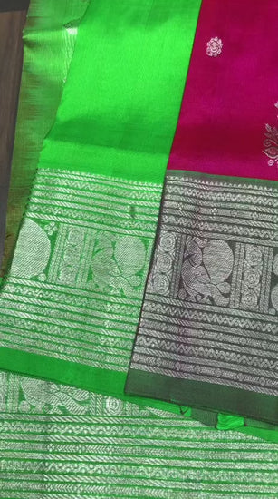This handwoven Venkatagiri Pattu saree blends traditional aesthetics with modern elegance through its radiant texture and detailed design.