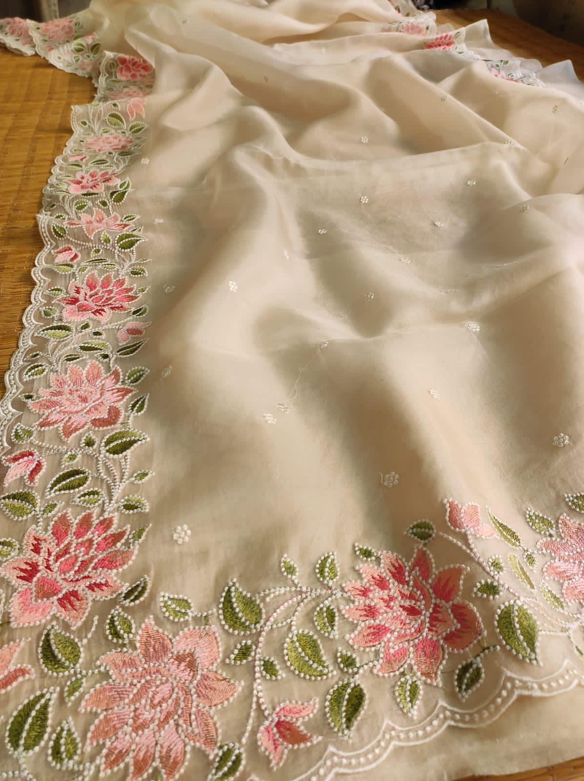 Expertly crafted from pure organza silk, the Zoey saree boasts a stunning multi-floral border embroidery. Luxurious and lightweight, this saree ensures both style and comfort for any occasion. Elevate your wardrobe with this elegant and timeless piece.
